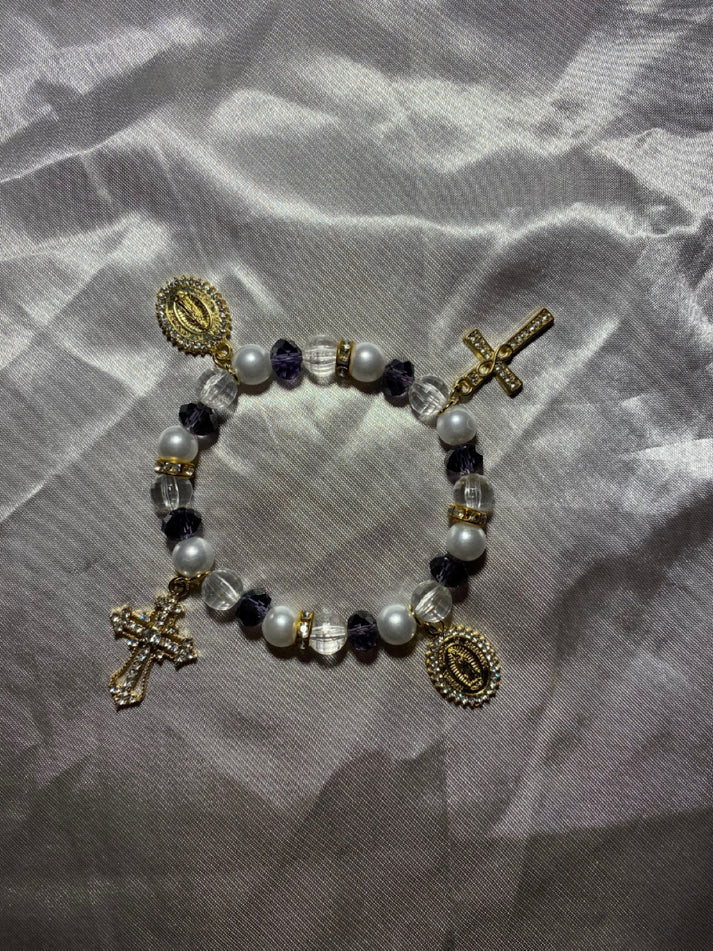 Dรฉcouvrez "ร‰clat de Pourpre", un bracelet ร  breloques qui allie รฉlรฉgance et spiritualitรฉ. Ce bijou unique se compose de perles aux teintes variรฉes : violet profond, blanc pur et transparent cristallin. Chaque perle a รฉtรฉ soigneusement sรฉlectionnรฉe pour crรฉer un ensemble harmonieux et รฉlรฉgant.ย Le bracelet est ornรฉ de quatre breloques significatives : deux croix dorรฉes et deux mรฉdailles de la Vierge Marie. Les croix symbolisent la foi et la protection, tandis que les mรฉdailles de la Vierge Marie apportent une touche de dรฉvotion et de grรขce. Les couleurs violettes รฉvoquent la noblesse et la spiritualitรฉ, le blanc reprรฉsente la puretรฉ et l'innocence, et le transparent ajoute une dimension de clartรฉ et de sรฉrรฉnitรฉ. Ensemble, ces รฉlรฉments crรฉent un bracelet qui est ร  la fois beau et porteur de sens.