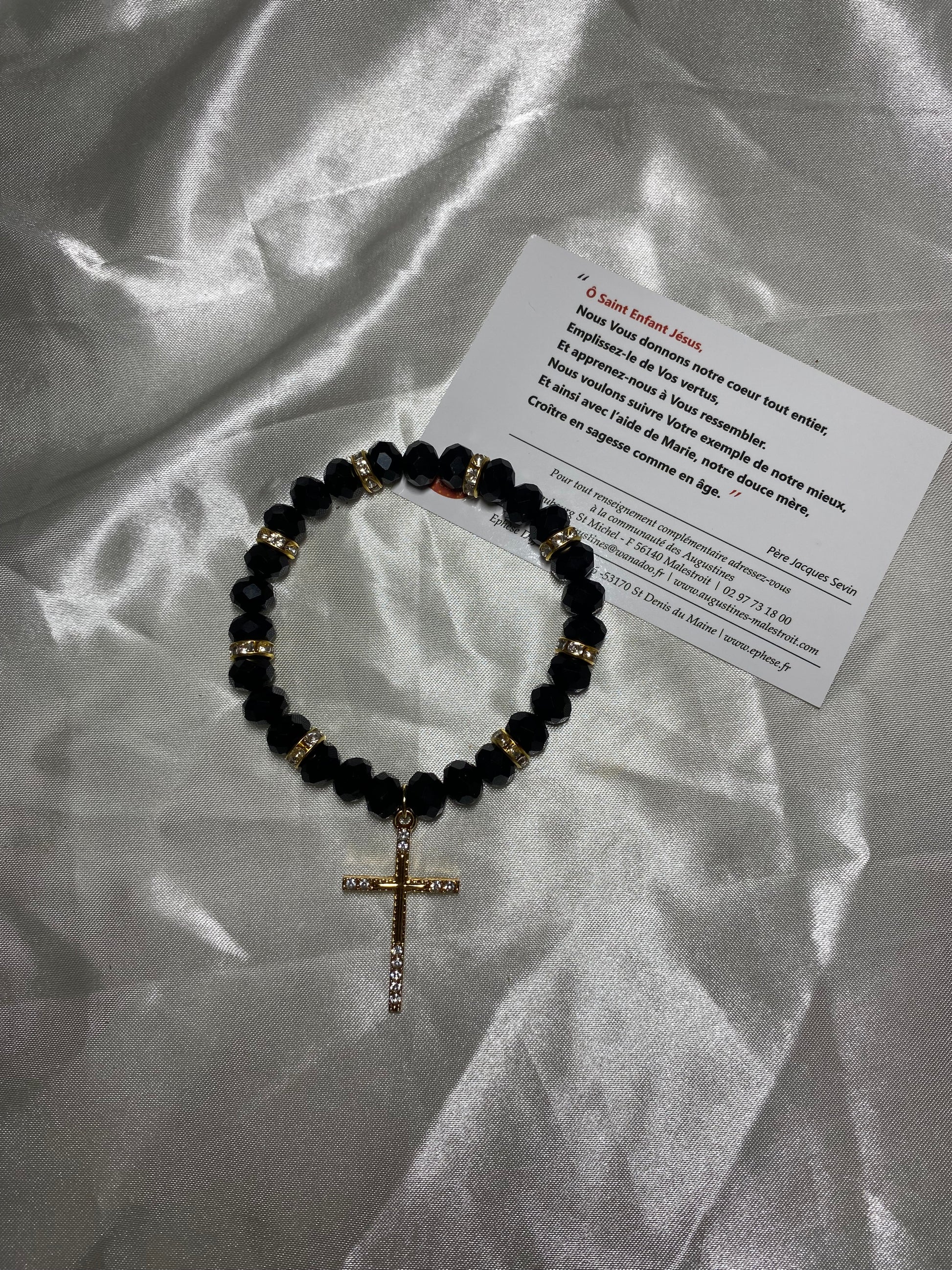 Le point focal du bracelet est une croix dorée longue, ajoutant une touche de luxe et de spiritualité à ce bijou unique. La croix dorée contraste magnifiquement avec les perles noires, créant un équilibre parfait entre audace et élégance.