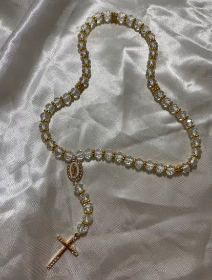 Ce magnifique chapelet est composé de perles transaprantes délicatement enfilées sur un fil doré, offrant un contraste élégant et raffiné. Les perles sont lisses et brillantes, ajoutant une touche de douceur et de féminité. Chaque dizaine est séparée par une petite perle dorée, ajoutent une dimension spirituelle et protectrice.