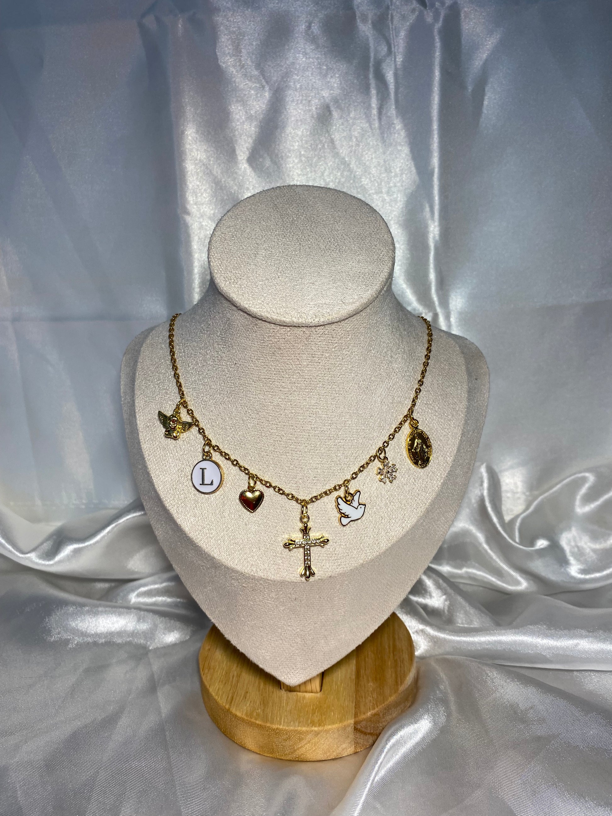 Collier charms Hibysctus doré orné de pendentifs symboliques, incluant une croix sertie, une colombe, un cœur, une médaille et une lettre personnalisée. Élégant et raffiné, il est parfait pour apporter une touche de spiritualité et de style à toutes vos tenues.