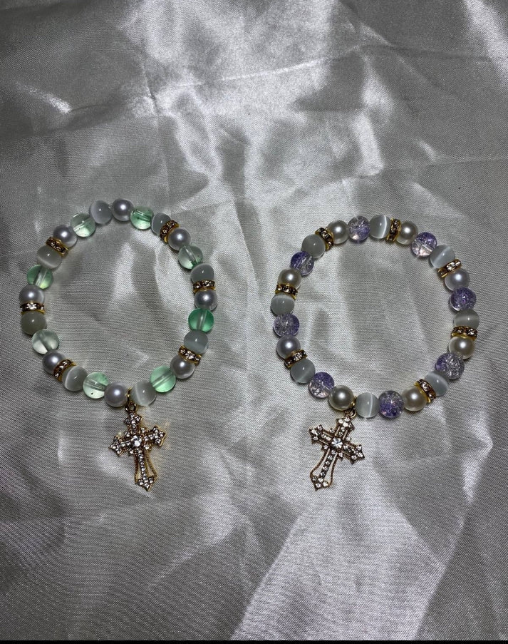 Ce duo de bracelets est une véritable célébration de l'harmonie et de l'élégance. Le premier bracelet, en perles vertes, évoque la fraîcheur et la vitalité de la nature. Le second, en perles violettes, symbolise la spiritualité et la sérénité. Au centre de chaque bracelet, une croix ornée de strass scintillants ajoute une touche de raffinement et de glamour. Parfaits pour être portés ensemble ou séparément, ces bracelets apportent une note de charme et de distinction à toute tenue, tout en symbolisant un équilibre parfait entre la force et la tranquillité.