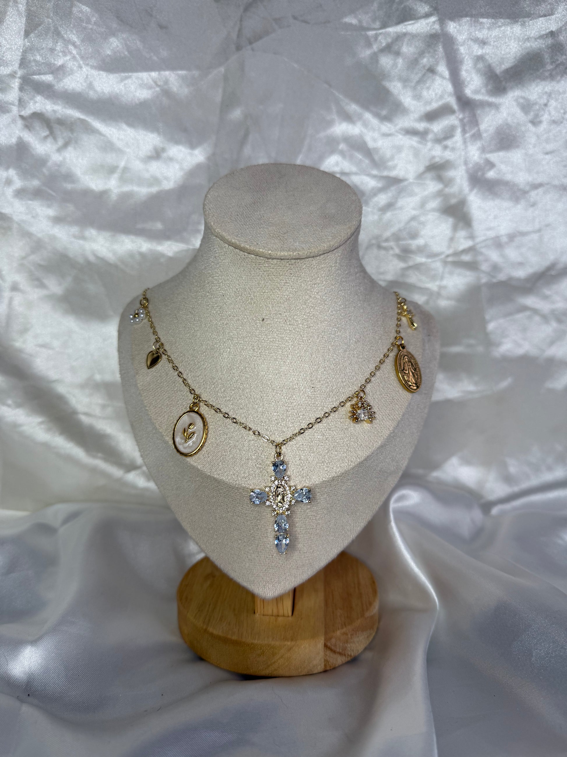 c’est un mélange de douceur et de foi, avec ses charms dorés et sa grande croix sertie de pierres lumineuses. Chaque détail a été pensé pour rappeler la beauté de la prière, la protection divine et la paix intérieure. Il se porte aussi bien pour les grandes occasions que pour garder un symbole fort près de soi, chaque jour.