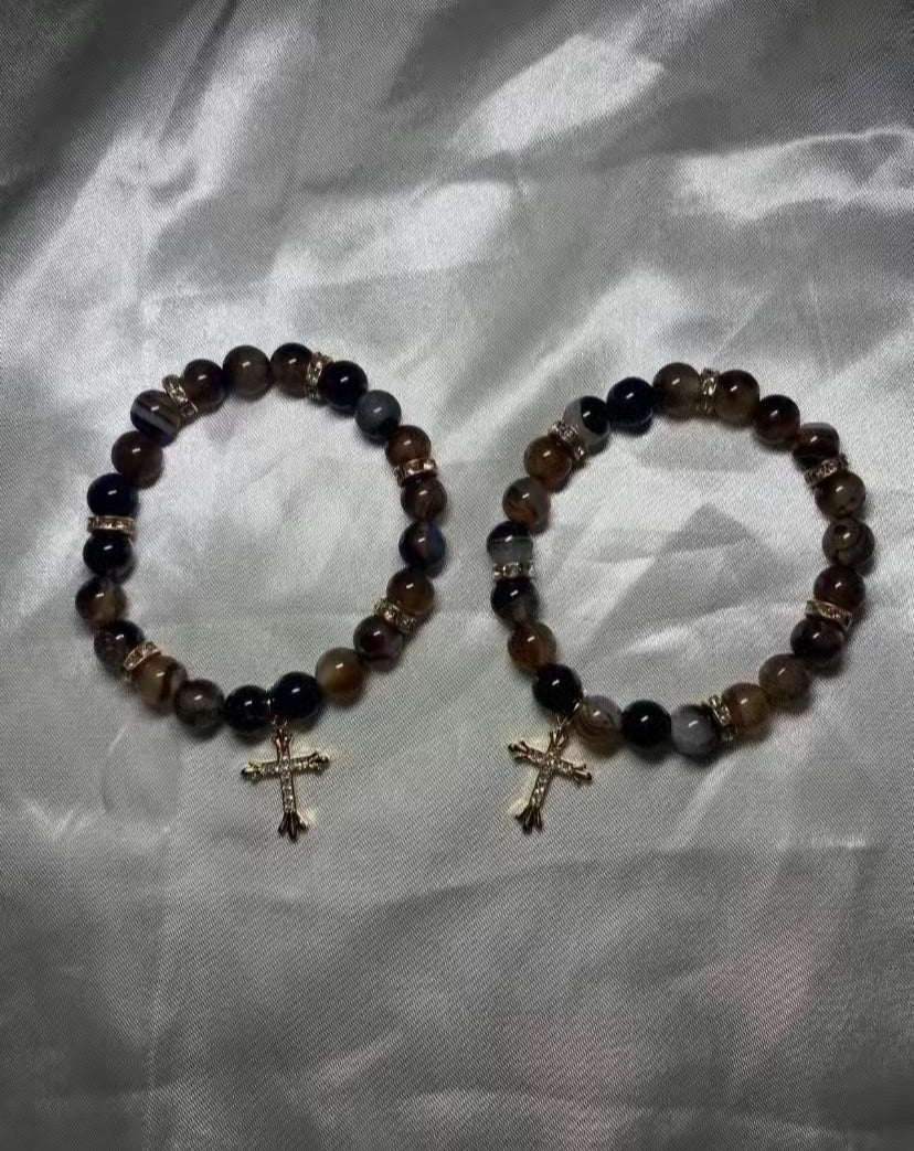 Découvrez l'élégance et la puissance spirituelle avec ces deux bracelets en perles d’œil de tigre ornés d'une croix chrétienne. Les perles d’œil de tigre, connues pour leurs propriétés protectrices et énergétiques, ajoutent une touche de sophistication et de mystère à chaque bracelet. Leur éclat doré et brun capte la lumière de manière envoûtante, créant un effet visuel captivant Chaque bracelet est rehaussé d'une croix chrétienne en métal argenté, symbole de foi et de dévotion. La croix apporte une dimension spirituelle et sacrée, faisant de ces bracelets non seulement des accessoires de mode, mais aussi des rappels constants de la foi et de la protection divine.