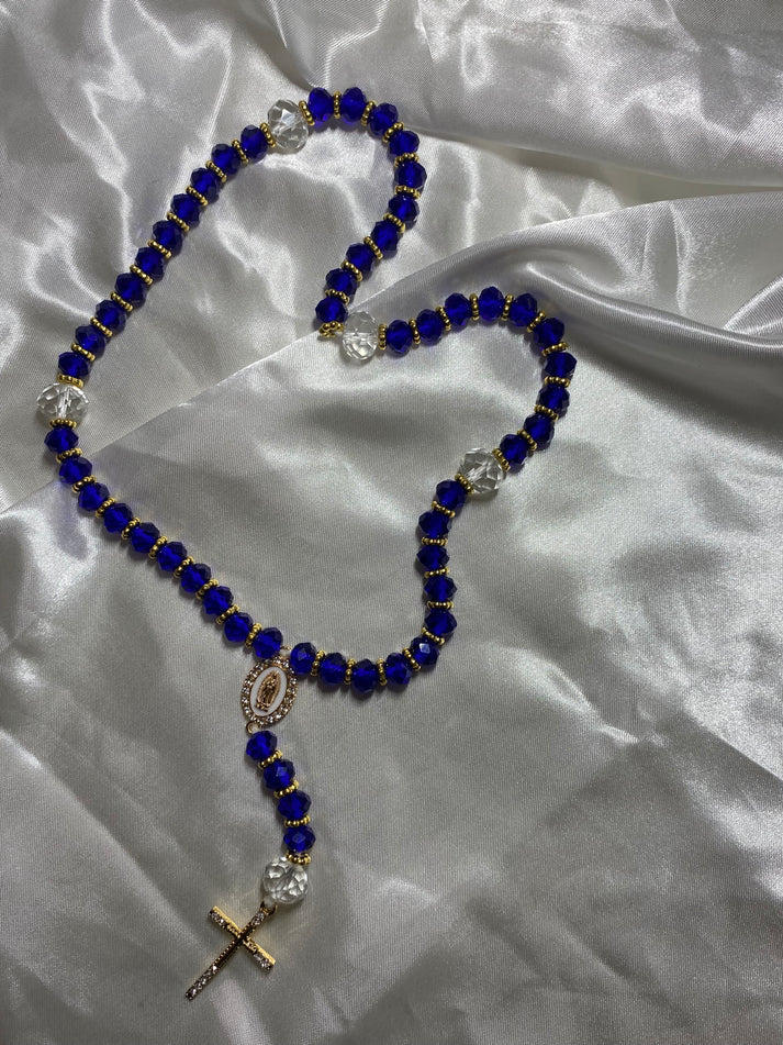 Ce magnifique chapelet est composé de perles bleu délicatement enfilées sur un fil doré, offrant un contraste élégant et raffiné. Les perles sont lisses et brillantes, ajoutant une touche de douceur et de féminité. Chaque dizaine est séparée par une petite perle dorée, ajoutent une dimension spirituelle et protectrice.