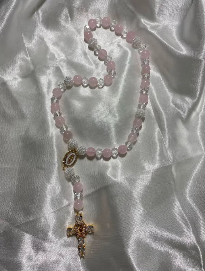 Découvrez notre chapelet d'une élégance rare, conçu pour apporter une touche de grâce à vos moments de prière. Ce chapelet est composé de magnifiques perles rose et transparentes, symbolisant la pureté et la tendresse. Pour chaque mystère, des perles blanches éclatantes ont été ajoutées, créant un contraste harmonieux et apaisant. Chaque perle est finement travaillée pour garantir une qualité exceptionnelle et une sensation agréable au toucher. Ce chapelet, avec ses perles délicates et ses nuances subtiles, est non seulement un instrument de dévotion, mais aussi une œuvre d'art spirituelle qui enrichira vos prières et méditations.