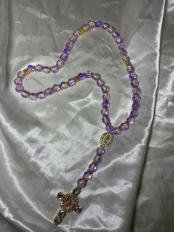 Le chapelet « Lueur de Lavande » est une véritable œuvre d'art. Ses perles rondes, d'un violet cristallin, captent la lumière avec une élégance envoûtante, créant un effet scintillant qui rappelle les champs de lavande sous le soleil. La croix, ornée de diamants, ajoute une touche de luxe et de raffinement. Ce chapelet est parfait pour ceux qui cherchent à allier spiritualité et beauté, offrant une lueur de sérénité et de grâce à chaque prière