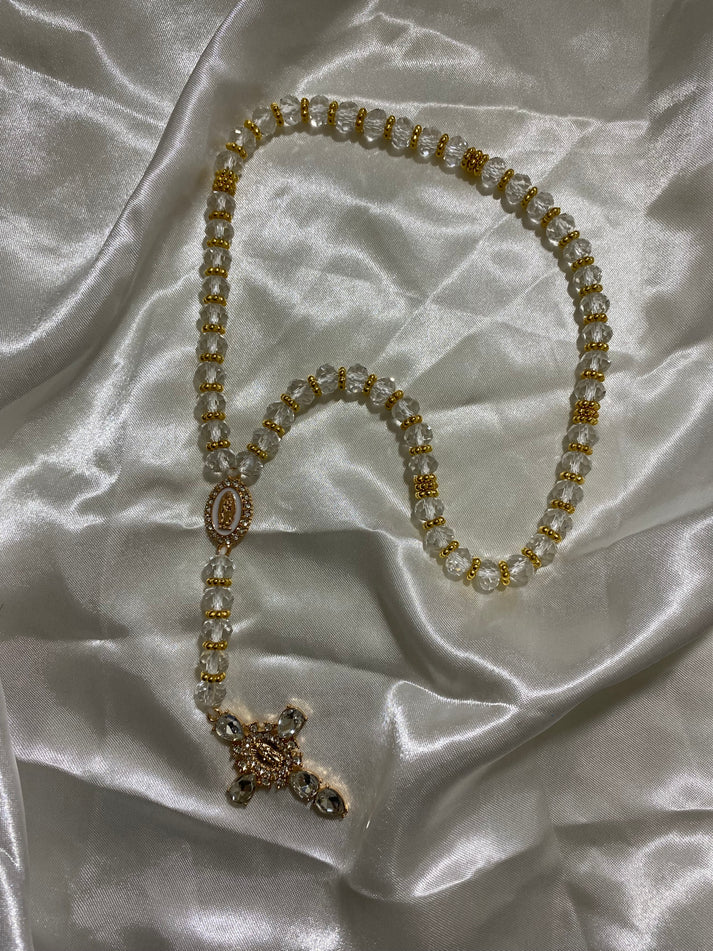 Ce magnifique chapelet est composé de perles transparante délicatement enfilées sur un fil doré, offrant un contraste élégant et raffiné. Les perles sont lisses et brillantes, ajoutant une touche de douceur et de féminité. Chaque dizaine est séparée par une petite perle dorée, ajoutent une dimension spirituelle et protectrice.