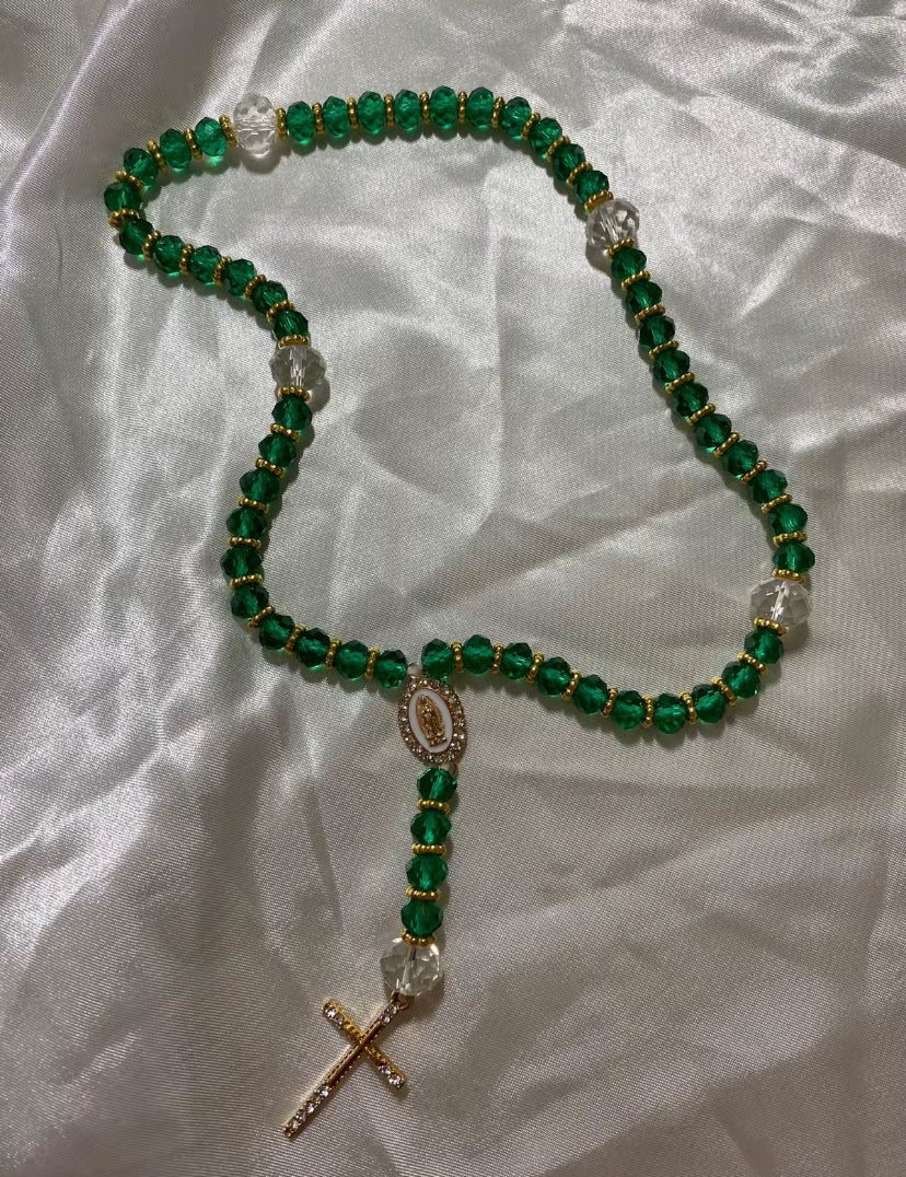 Le chapelet "Émeraude Divine" est une pièce d'une élégance rare, confectionnée avec soin et dévotion. Il est composé de perles à facettes d'un vert sapin profond, rappelant la majesté des forêts éternelles. Chaque perle capte la lumière, créant des reflets scintillants qui évoquent la pureté et la sérénité. Pour marquer les mystères, de grosses perles à facettes transparentes sont intégrées, ajoutant une touche de clarté et de distinction à l'ensemble. Ces perles transparentes contrastent magnifiquement avec le vert sapin, symbolisant la lumière divine au cœur des mystères sacrés.